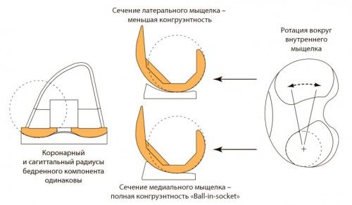 Система протезирования коленного сустава Advance® Medial-Pivot (MP) позволяет замещать коленный сустав как с резекцией,так и с сохранением задней крестообразной связки благодаря механизму «Ball-in-socket» («Шар во впадине»).Исследования показали, что в нормальном коленном суставе большеберцовая кость при сгибании вращается относительно оси внутреннего мыщелка бедра. Система Advance® MP позволяет сохранить та кую кинематику после протезирования коленного сустава, исключая возникновение парадоксальных движений , присущих традиционным системам.